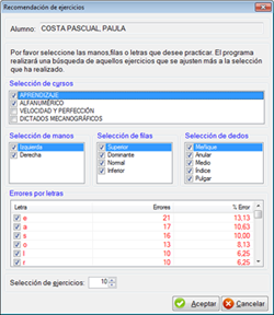 Opción para realizar una búsqueda personalizada de ejercicios que contengan aquellos caracteres que desees practicar. La aplicación buscará y te propondrá aquellos ejercicios que mejor se ajusten a tu selección. Ideal para acabar de perfeccionar aquellas teclas que se te resisten.